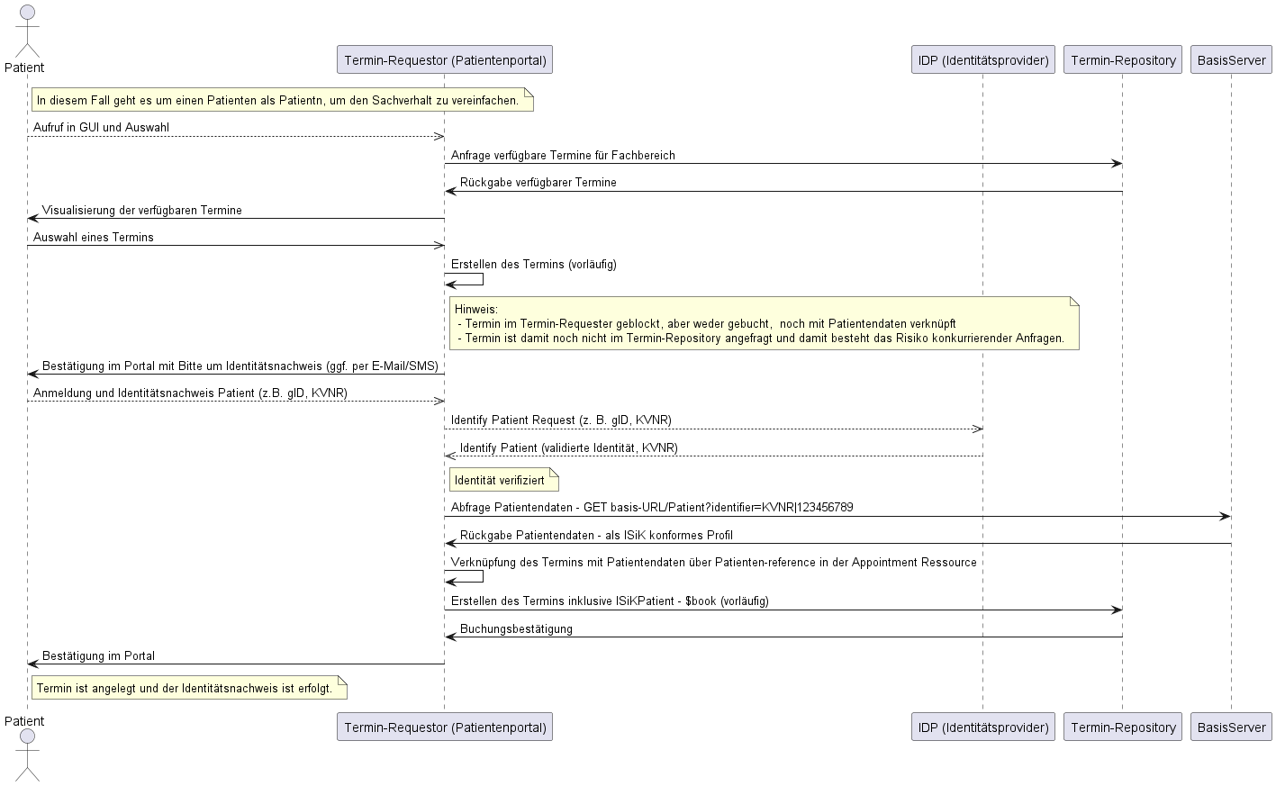 Folgendes Sequenzdiagramm detailliert den Ablauf unter Berücksichtigung der Akteure Termin-Requestor (z.B. Patientenportal) und Termin-Repository (z.B. KIS); offen bleibt hier allerdings noch der Ablauf zum Austausch von Patientendaten zwischen den Systemen: