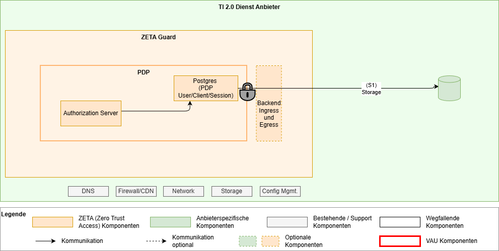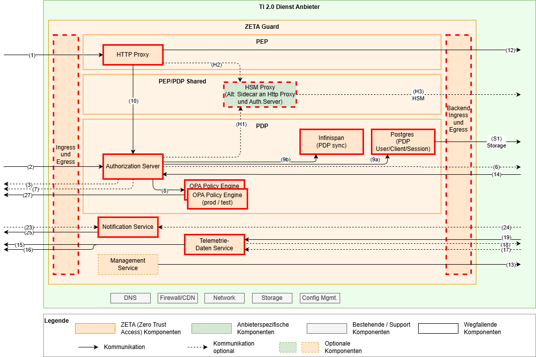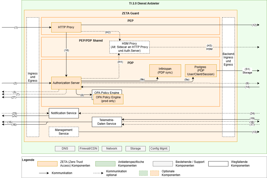 Die Zerotrust Architektur nimmt an, dass alle Akteure potenziell gefährlich sind und fordert daher – regelbasierte Prüfung aller Zugriffe. Der Fachdienst ist daher prinzipiell co-located zum ZETA-Guard und alle Zugriffe von diesem geschützt.