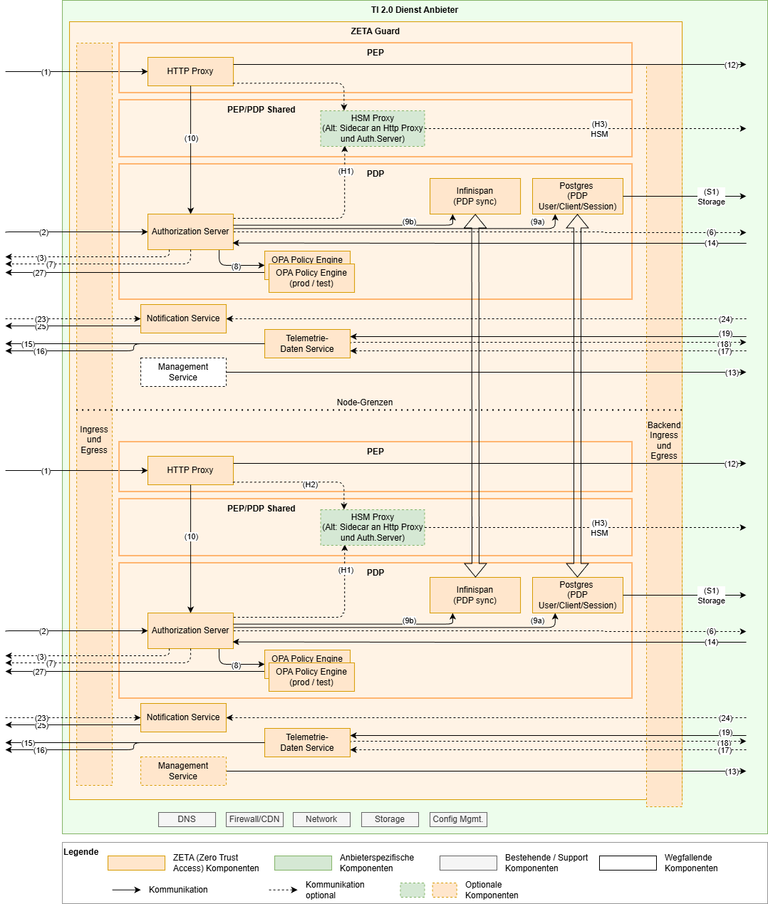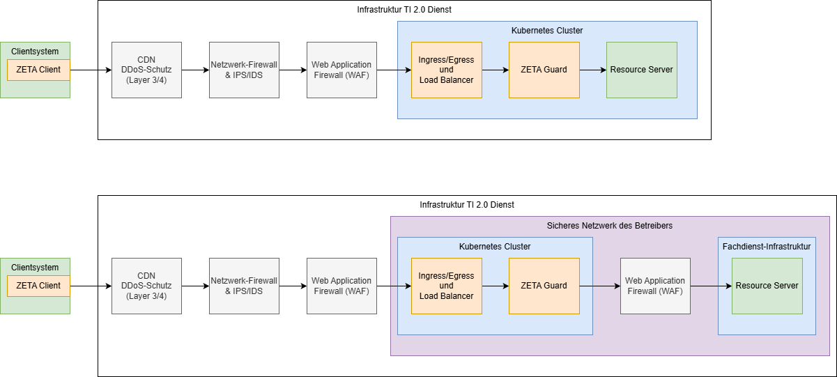 Falls der Fachdienst in einer eigenen Infrastruktur separat vom ZETA-Guard betrieben wird, muss eine sichere Verbindung zwischen ZETA-Guard und Fachdienst aufgespannt werden. Dies kann mTLS oder ein abgesichertes Netz sein, und ist in die jeweiligen Sicherheitsbetrachtungen des Fachdienstes anhand dessen Sicherheitsanforderungen nachzuweisen.